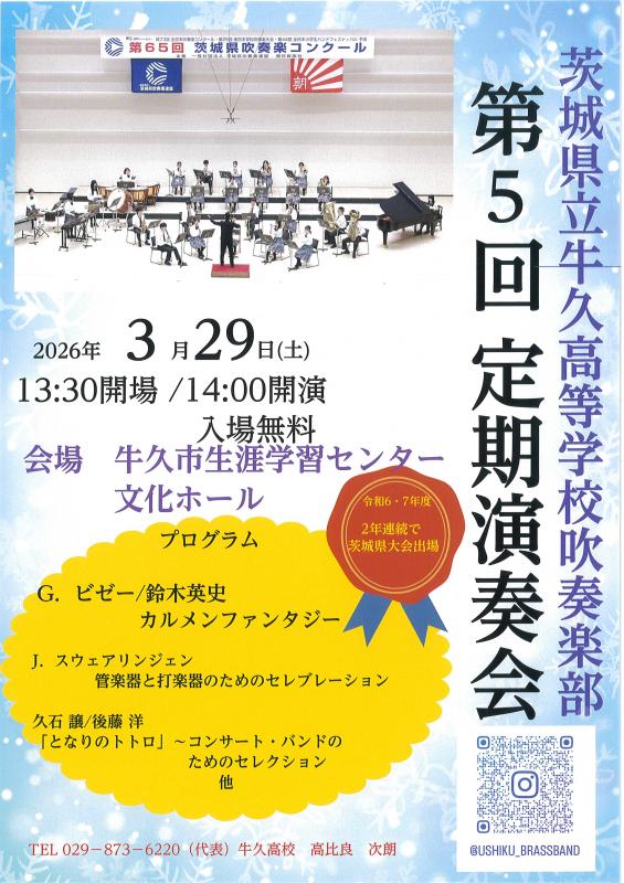 牛久高校吹奏楽部では、来る令和8年3月29日(日)牛久市生涯学習センター文化ホールにおいて第4回定期演奏会を下記のとおり開催いたします。お忙しい中とは思いますが、お誘い合わせの上、是非お越しください。